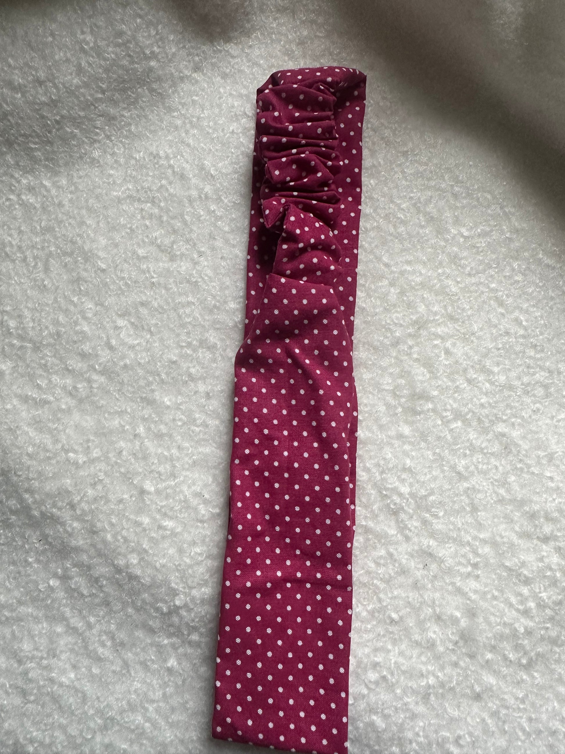 Apportez une touche de douceur et de style à votre quotidien avec le Bandeau Bertille. Son tissu framboise à petits pois blancs illumine vos tenues tout en restant délicatement discret.