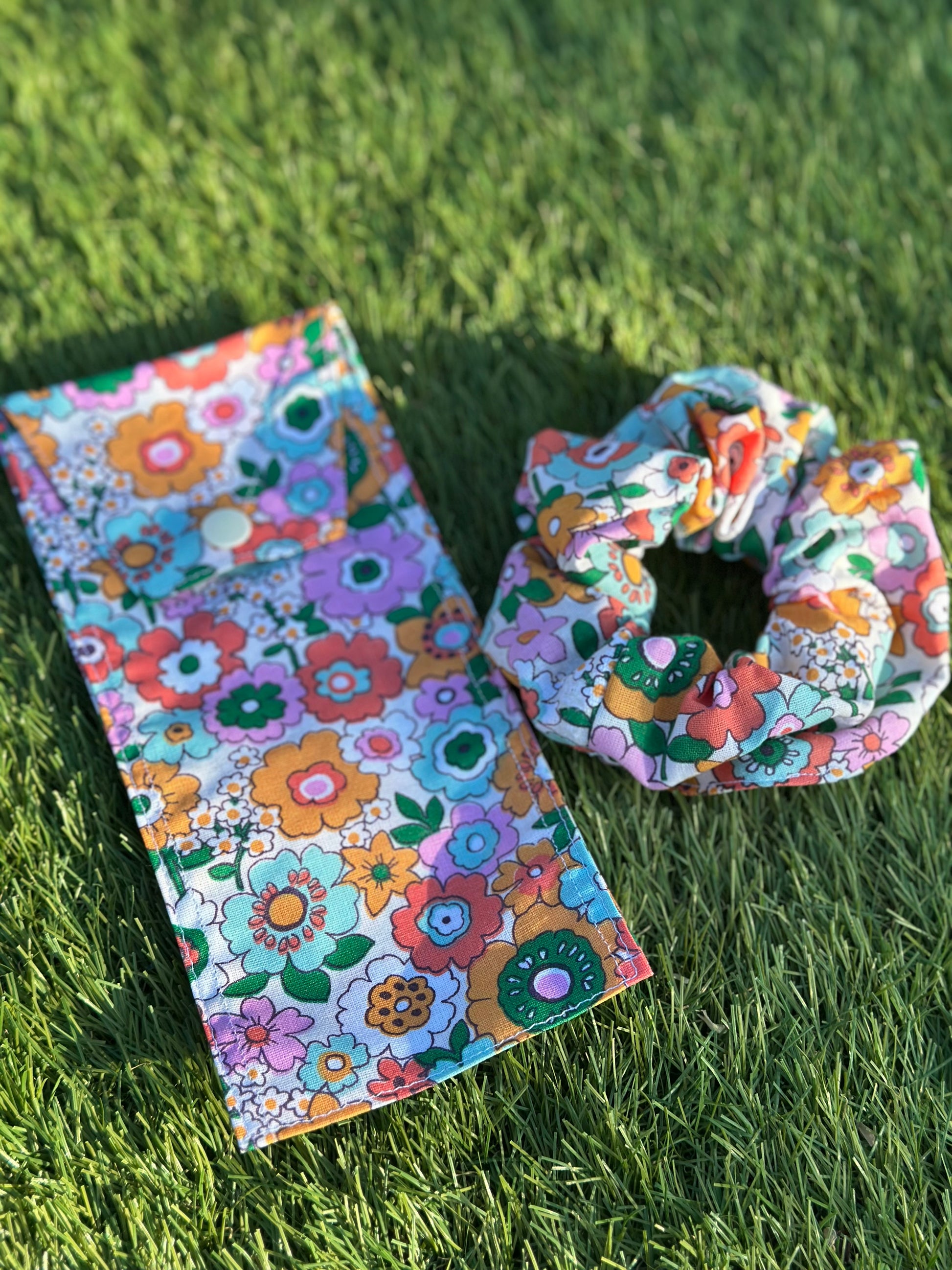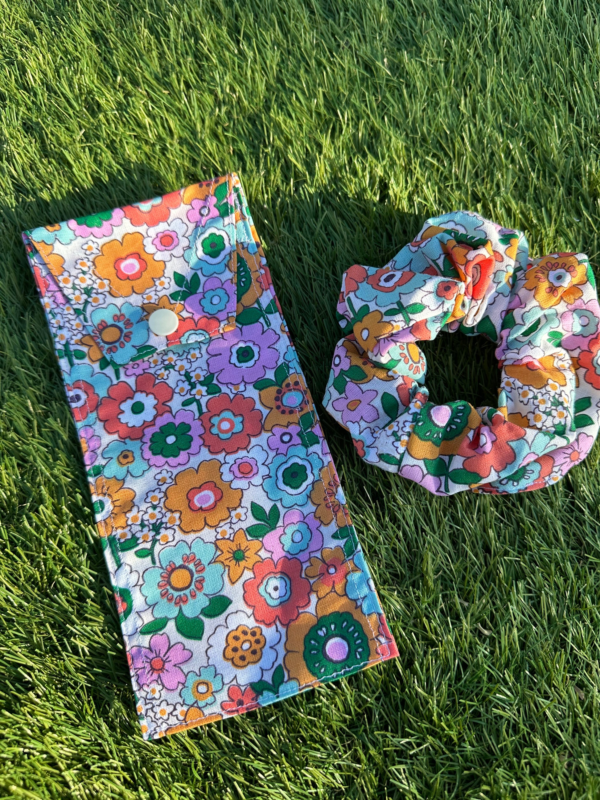 Un chouchou assorti, à l’imprimé rétro fleuri, parfait pour relever les cheveux avec style ou accessoiriser une tenue.